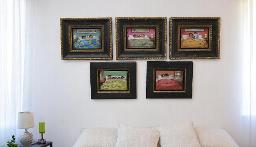 Manon Otis (1958 -, Can.), "Scène de lit" nos 63, 80, 81 et 83, et "Famille 6", 5 acryliques sur toile, signées. Toutes signées, titrées et datées 1999 au verso. 12,7 cm x 17,8 cm chacune.